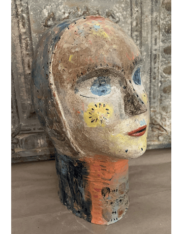 escultura cabeza Primadonna, modelada a mano en cerámica de gres y trabajada por el artista Gastón Bertrand en la pintura con una gran gama de fusión de pigmentos y óxidos. Se usó un esmalte trasparente para resaltar el rico colorido de los pigmentos aplicados por capas